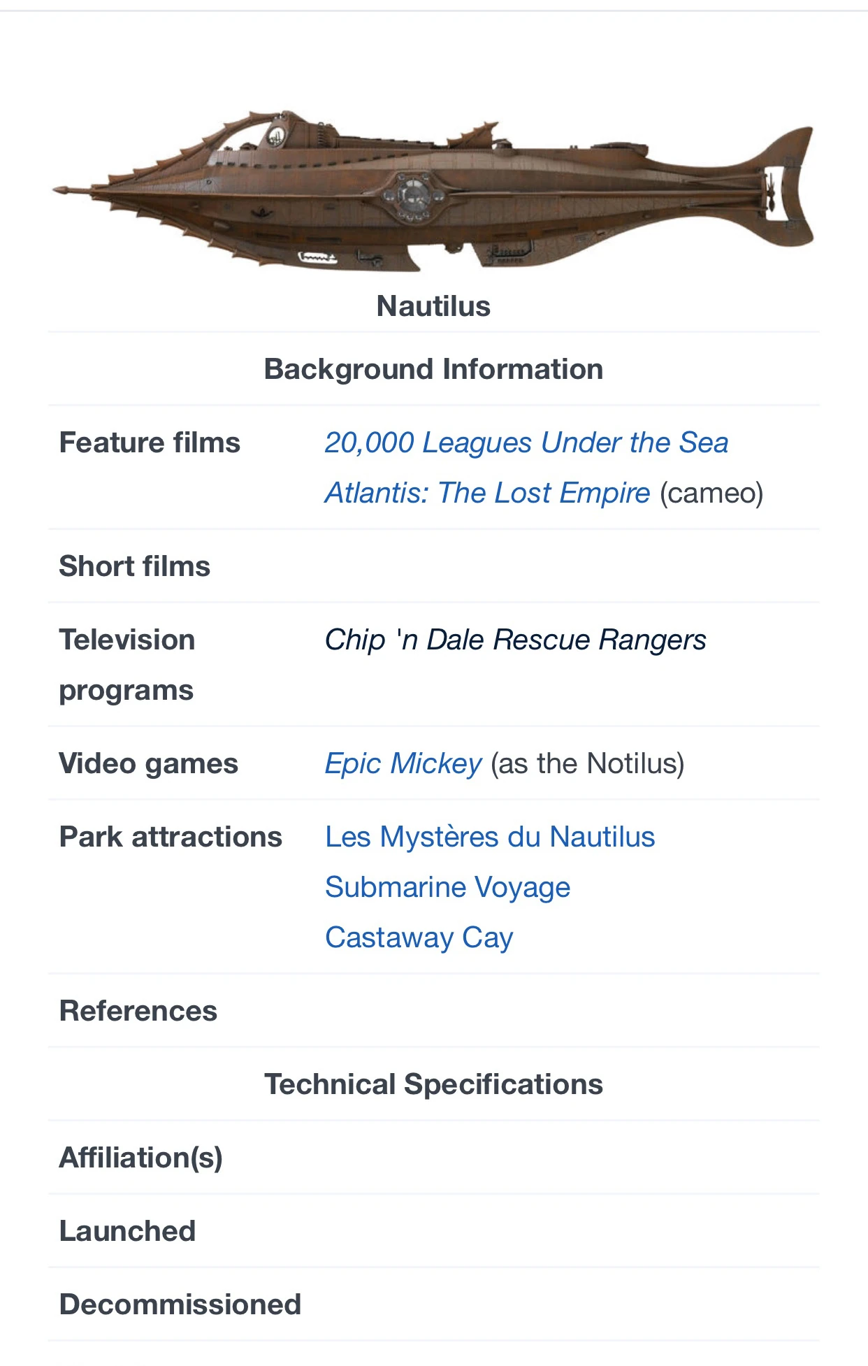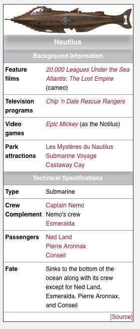 Desktop infobox: Here's the infobox on the Disney Wiki's page about the Nautilus. It's a great infobox that's very easy to read — as long as your only concern is the desktop.